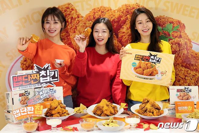 (서울=뉴스1) 황기선 기자 = 16일 서울 마포구 굽네 플레이타운에서 모델들이 굽네의 신제품 '맵단짠 칩킨'을 소개하고 있다.