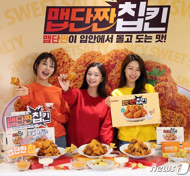 (서울=뉴스1) 황기선 기자 = 16일 서울 마포구 굽네 플레이타운에서 모델들이 굽네의 신제품 '맵단짠 칩킨'을 소개하고 있다.