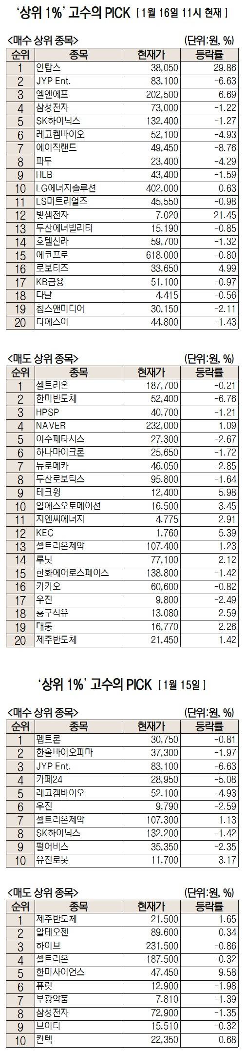 미래에셋증권에서 거래하는 고수익 투자자들이 16일 오전 가장 많이 순매수한 종목은 인탑스(049070)다. JYP엔터테인먼트(JYP Ent.(035900)), 엘앤에프(066970), 삼성전자(005930), SK하이닉스(000660) 등도 순매수 상위권에 이름을 올렸다.
