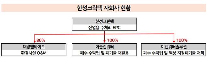 한성크린텍은 최근 3년간 수처리 관련 기업을 인수합병하며 사세를 확장했다. 2021년 이엔워터솔루션(폐기물 및 폐수 처리 기업), 대양엔바이오를 차례대로 인수했으며, 액상 폐기물 전문기업 이클린워터를 자회사로 두고 있다.