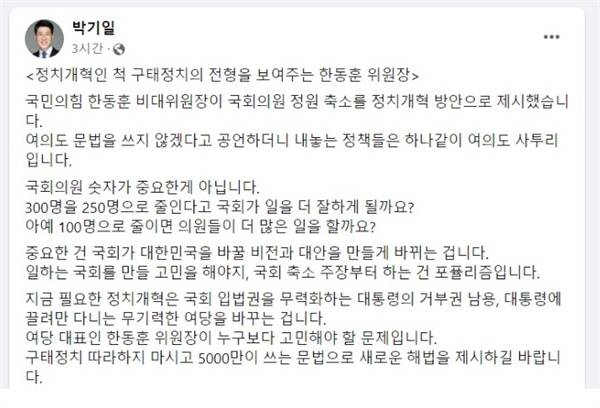 | ▲ 더불어민주당 박기일 천안을 국회의원 예비후보가 16일 자신의 SNS를 통해 국민의힘 한동훈 비대위원장이 정치개혁안으로 내놓은 국회의원 정수 축소를 비판했다. 사진 박기일 예비후보 페이스북 갈무리 |