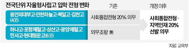 또 기존에 사회통합전형 선발 의무가 없던 6개 전국단위 자사고(옛 자립형사립고)도 사회통합전형으로 20% 이상을 선발해야 한다. 다만 사회통합전형 미달 시에는 부족 인원의 50%를 일반전형으로 뽑을 수 있도록 허용한다.