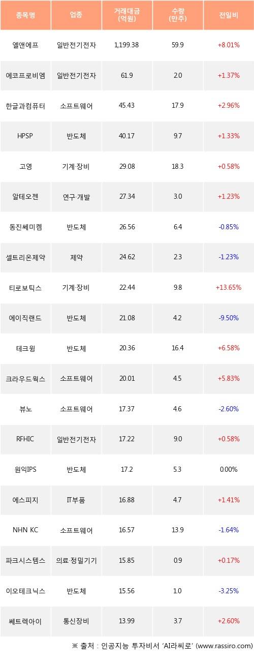 기관 투자자의 순매수 상위 20개 종목은 엘앤에프, 에코프로비엠, 한글과컴퓨터, HPSP, 고영, 알테오젠, 동진쎄미켐, 셀트리온제약, 티로보틱스, 에이직랜드등이다.