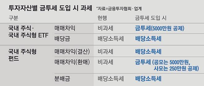 16일 금융투자업계에 따르면 펀드 업계 관계자들은 금투세 도입 시 국내 주식형 펀드 상품에서 자금 유출이 발생할 것이라고 지적한다. 종전 국내 주식형 펀드의 매매 차익은 비과세 혜택을 적용했는데, 금투세를 도입하면 결산 이익금에 배당소득세가, 환매 이익에 대해선 금투세를 적용하기 때문이다.