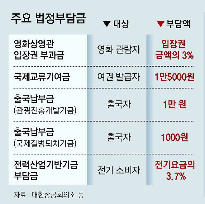정부가 올해 진행할 부담금 평가에서는 영화상영관 입장권부과금이나 국제교류기여금, 출국납부금 등이 우선 도마에 오를 것으로 보인다. 영화관 입장권 가격의 3%인 입장권부과금은 영화발전기금 조성에 쓰이는데 영화 관련 사업자들이 내야 할 돈을 관람객이 내는 것 아니냐는 지적이 제기돼 왔다.