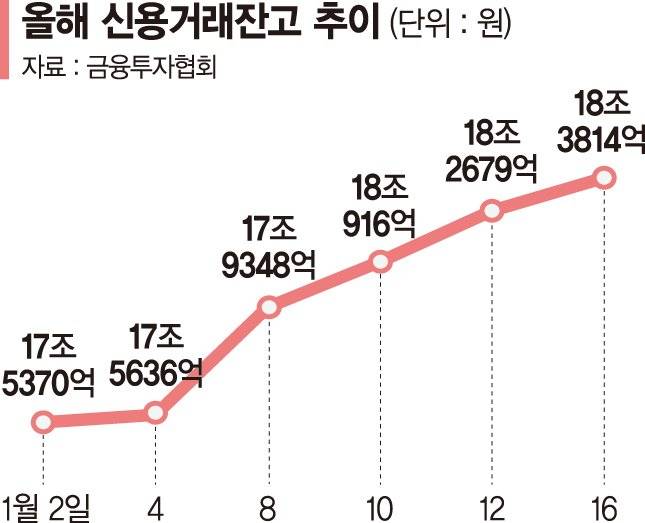 문제는 새해 들어 증시가 빠지는 데도 신용거래융자는 늘어나고 있다는 점이다. 이달 4일 이후 9거래일 연속으로 증가 추세다. 지난 10일 약 두 달 만에 18조원을 넘은 뒤로도 증가세가 유지되고 있다.
