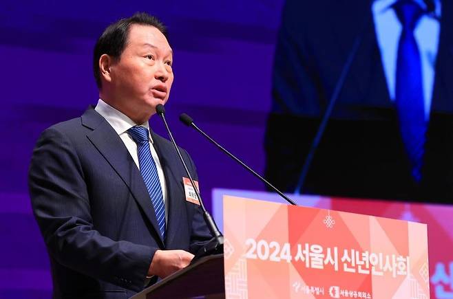 [최태원 서울상공회의소 회장이 지난 5일 오후 서울 중구 대한상공회의소 국제회의장에서 열린 서울시 신년인사회에 참석해 신년사하고 있다. (사진=연합뉴스)]