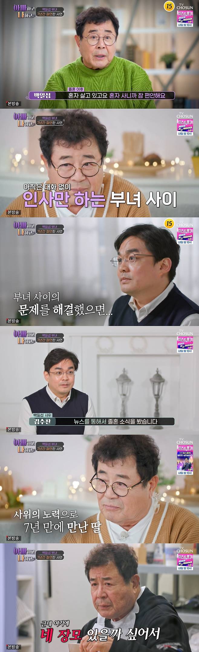 하지만 사위는 부녀의 관계 개선을 위해 먼저 백일섭에게 연락을 했다고. 백일섭은 "나도 보고 싶었고 궁금했다. 가게도 오픈한 걸 알았다. 근데 아내랑 마주칠까봐 망설이고 있었다"며 사위의 만남 제안을 수락하기까지 1년이라는 시간이 걸렸다고 밝혔다.