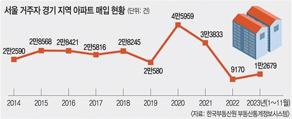 17일 한국부동산원이 보유한 매입자 거주지별 아파트 매매 현황을 집계한 결과 서울 거주자가 지난해 1~11월 매수한 경기 소재 아파트는 1만2679채로 12개월치인 2022년 전체 9170채보다도 38.3% 많았다. 2022년 1월부터 11월까지 같은 기간 매입한 8704채와 비교하면 45.7% 늘었다.