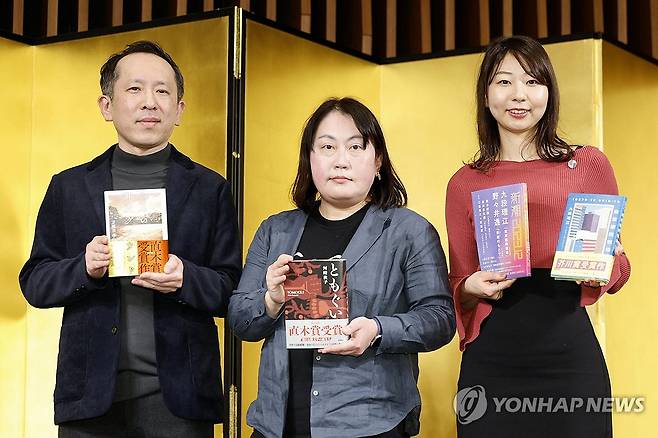 (도쿄 교도=연합뉴스) 일본 문학상인 아쿠타가와상과 나오키상 수상자들이 17일 도쿄에서 책을 들어 보이고 있다. 왼쪽부터 마키메 마나부, 가와사키 아키코(이상 나오키상 수상자), 구단 리에(아쿠타가와상 수상자). 2024.1.18