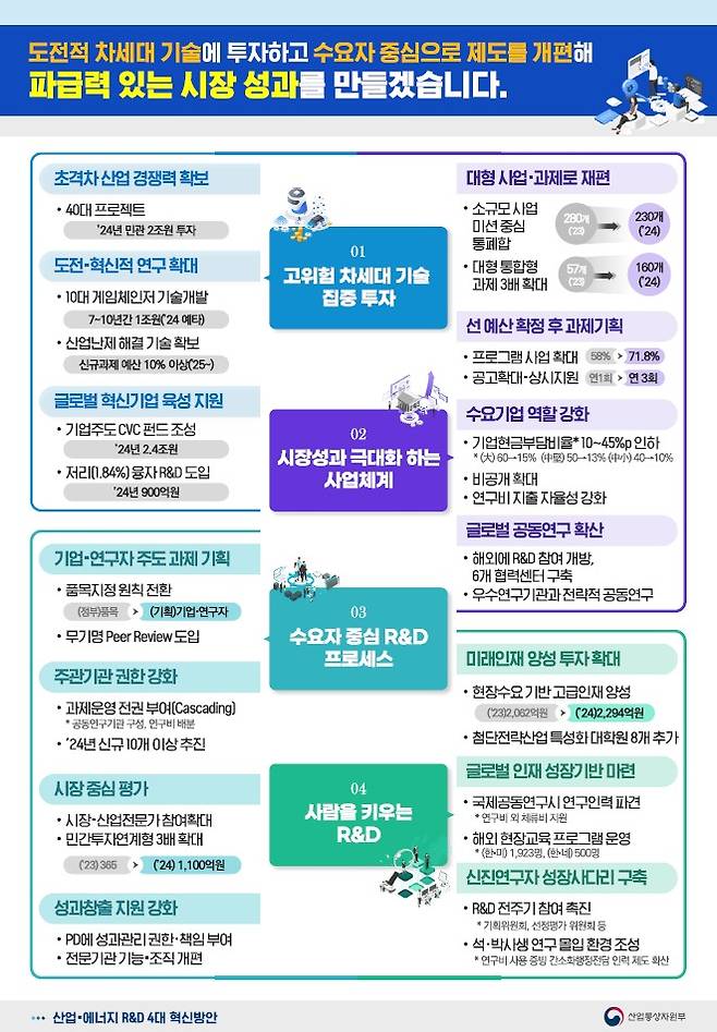 이번 투자전략·제도혁신 방안은 기업과 연구자가 과제 기획과 운영의 전권을 행사하는 수요자 중심의 프로세스로 전환하기 위해 마련됐다.