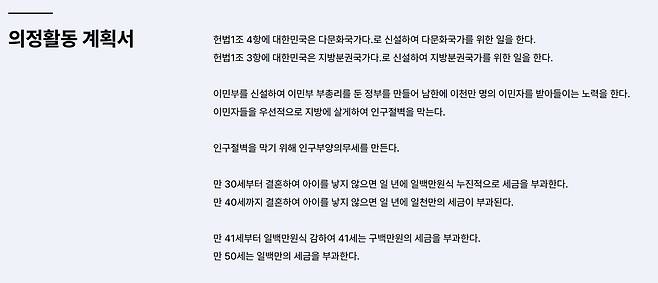 18일 <오마이뉴스> 취재를 종합하면 대구 달서구병 출마를 앞둔 남원환 예비후보는 적격심사 때 제출한 의정활동 계획서에 '인구 절벽을 막기 위해 인구부양의무세를 신설하겠다'는 공약을 담았다. 만 30세부터 결혼해 아이를 낳지 않으면 100만 원씩 누진적으로 세금을 부과해 만 40세가 되는 해에도 아이를 낳지 않으면 1000만 원을, 만 41세부터는 100만 원씩 줄여 50세에는 100만 원의 세금을 내도록 하자는 제안으로, 비출산에 징벌 성격의 과세를 하겠다는 격이다.