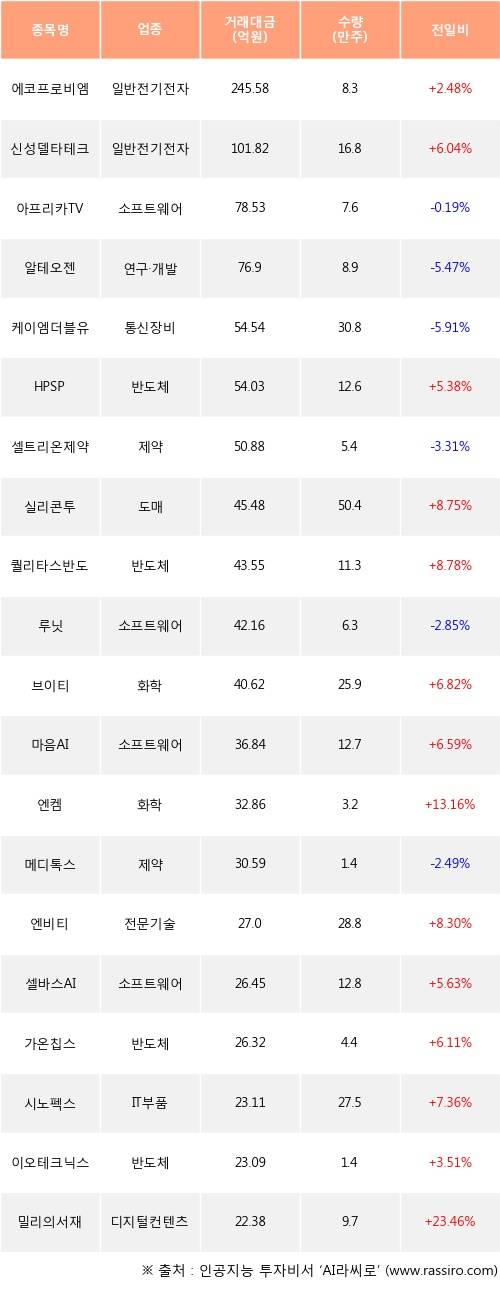 에코프로비엠, 신성델타테크, HPSP 등은 전일 대비 주가가 상승했고, 아프리카TV, 알테오젠, 케이엠더블유 등은 주가가 하락했다.