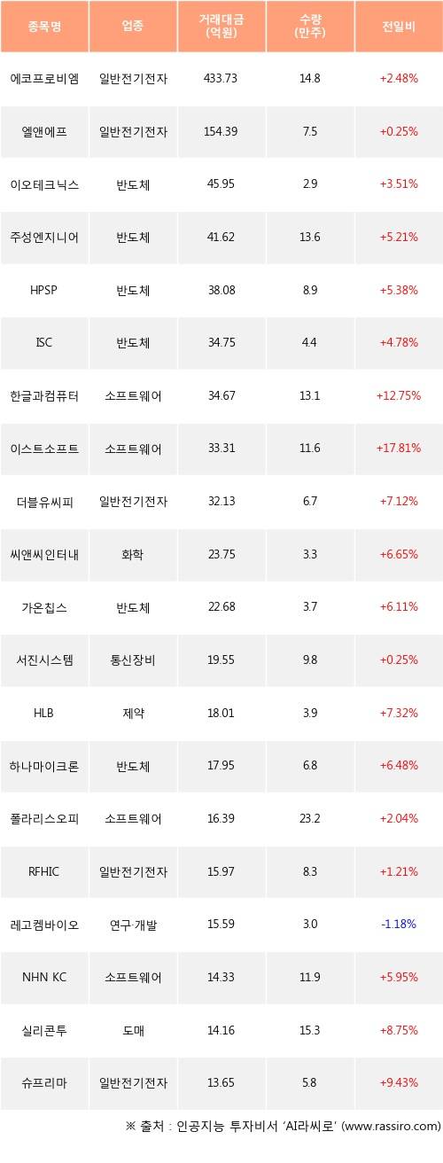 기관 투자자의 순매수 상위 20개 종목은 에코프로비엠, 엘앤에프, 이오테크닉스, 주성엔지니어링, HPSP, ISC, 한글과컴퓨터, 이스트소프트, 더블유씨피, 씨앤씨인터내셔널등이다.