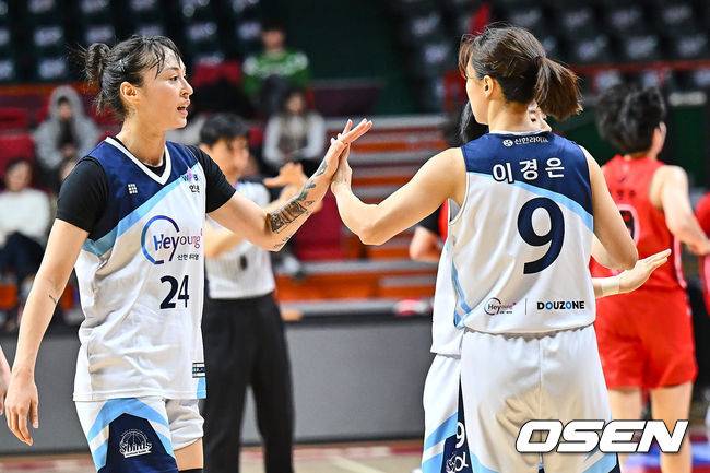 인천 신한은행 김소니아가 1쿼터부터 큰 점수차로 리드하며 이경은과 하이파이브를 하고 있다. 2024.01.18 / foto0307@osen.co.kr