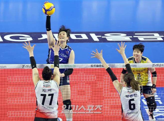 IBK기업은행 김희진이 정관장 블로킹을 피해 공격하고있다.
