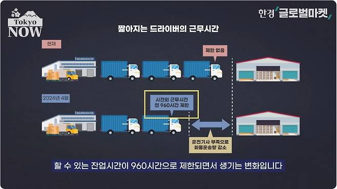 인구감소의 역습…'물류 2024년 문제' ②에서 계속 '물류 2024년 문제'는 오는 4월부터 트럭 운전기사가 부족해 2030년이면 일본 전체 화물의 35%가 멈춰서게 되는 위기를 말한다. 전문가들의 우려나 전망, 혹은 아직은 먼 미래의 이야기가 아니다.