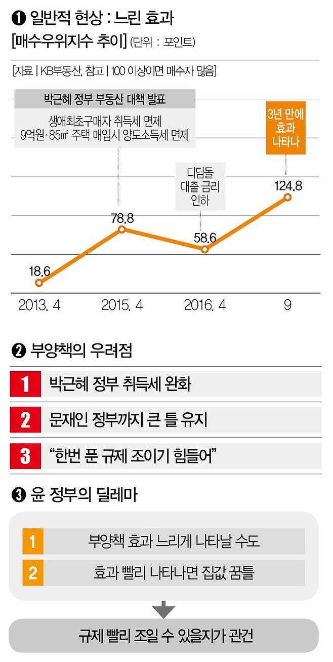 ■ 의문➋ 규제 해제의 부메랑 = 물론 2013 ~2016년과 지금의 정책 효과가 똑같지 않을 가능성도 있다. 2013~2016년과 같은 집값 하락기에선 어떤 부양책도 통하기 어렵지만, '바람만 불어도 분위기가 달라지는' 지금과 같은 시기엔 규제 해제가 집값 상승을 부채질할 가능성도 없지 않다.