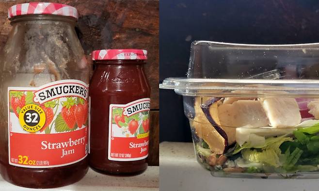 | ▲ 패밀리 사이즈라고 하는 큰 용량의 제품의 이전 가격이 요즘은 일반 사이즈 제품가가 되고 있다. 근소한 차이로 가격이 비슷해진 잼과 가격은 올랐지만 내용과 양이 부실해진 한끼 샐러드 제품. |