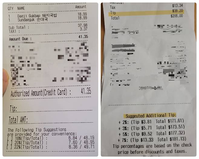 | ▲ 최근의 팁 문화 1~2달러 아래이던 식당의 음료수를 3.99달러로 받기 시작했다. 영수증에 아예 팁을 인쇄해 오는 일이 대다수이고 18% 아래로는 팁을 지불하지 못하게 암시하는 듯하다. 이미 25% 가까이 팁을 계산했는데 팁을 더 줄 수 있다고 써있는 계산서. 코스트코도 이런 방법으로 배달하는 이에게 추가 팁을 줄 수 있도록 유도한다. |