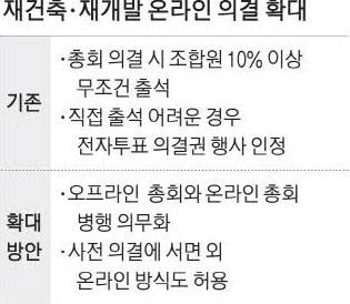 정부가 대기업 주주총회처럼 재개발·재건축 사업에도 전자투표 등 비대면 의결 방식을 확대하는 방안을 추진 중이다.