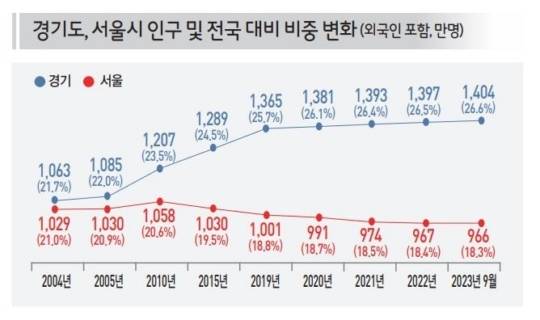 인구 증가에 따라 전국 대비 경기도 인구 비중은 2013년 24.1%에 2023년 26.7%로 2.6%포인트 올라갔다.