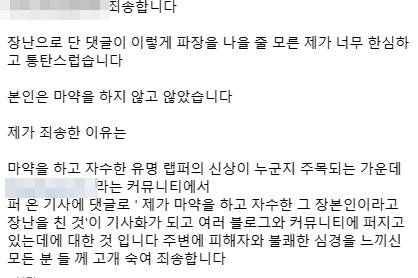 그는 "본인은 마약을 하지 않고 않았습니다. 제가 죄송한 이유는 마약을 하고 자수한 유명 랩퍼의 신상이 누군지 주목되는 가운데 커뮤니티에서 퍼 온 기사에 댓글로 ' 제가 마약을 하고 자수한 그 장본인이라고 장난을 친 것'이 기사화가 되고 여러 블로그와 커뮤니티에 퍼지고 있는데에 대한 것 입니다"라며 "주변에 피해자와 불쾌한 심경을 느끼신 모든 분 들 께 고개 숙여 죄송합니다"라고 사과했다.