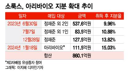 이후 소룩스는 아리바이오 지분을 늘리기 시작했다. 매수 대상은 주로 정 대표 지분이었다. 소룩스는 작년 7월 정 대표와 정재현씨 지분 0.46%씩을 총 83억5000만원에, 같은 해 12월 정 대표 지분 2.94%를 127억5000만원에 매입했다. 총 세 번의 거래에서 정 대표가 소룩스로부터 받은 대가는 395억원이 넘는다. 정 대표로선 소룩스 최대주주가 되기 위해 투입한 돈(300억원)을 모두 돌려받은 셈이다.