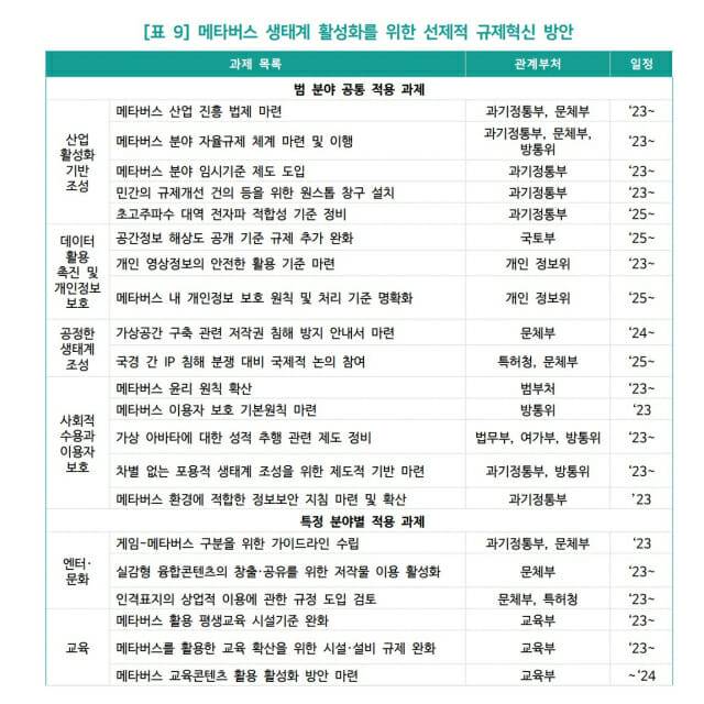 한편 우리 정부는 지난 2022년 '디지털 신대륙, 메타버스로 도약하는 대한민국’을 비전으로하는 범부처가 참여해 만든 '메타버스 신산업 선도전략'을 발표한 바 있다. 당시 정부는 이 전략에서 4대 목표로 ▲글로벌 메타버스 선점 ▲메타버스 전문가 양성 ▲메타버스 공급기업 양성 ▲메타버스 모범사례 발굴을 제시했다. 또 24개 세부 과제로 ▲플랫폼 발굴 지원 ▲한류 콘텐츠 제작 지원 ▲고급 및 전문 인재양성 ▲통합지원 거점 구축 ▲스타기업 육성 ▲윤리 정립 등을 선정해 발표했다.