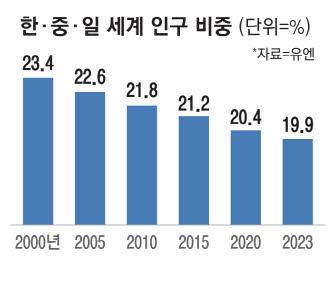 유엔이 관련 통계를 내놓은 1950년 이후 한·중·일 인구 비중 20%가 붕괴된 것은 이번이 처음이다.