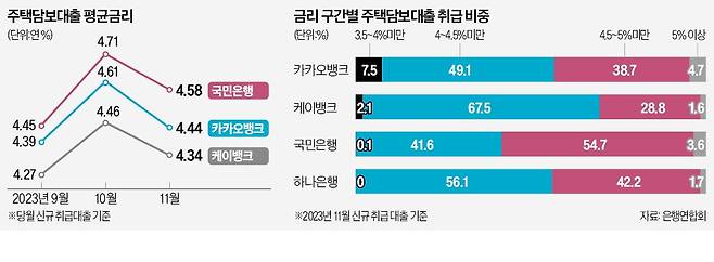 21일 은행연합회 소비자포털에 따르면 국민 신한 하나 우리 농협 등 5대 은행과 인터넷은행 중 가장 낮은 금리로 주담대를 내준 곳은 케이뱅크인 것으로 파악됐다. 케이뱅크가 작년 11월 새로 취급한 분할 상환 방식 주담대의 평균 금리는 연 4.34%로 10월(연 4.46%) 대비 0.12%포인트 하락했다. 케이뱅크에 이어 주담대 평균 금리가 낮은 은행은 카카오뱅크(연 4.44%)였다. 은행연합회가 공개하는 대출금리는 2개월 시차가 있다.