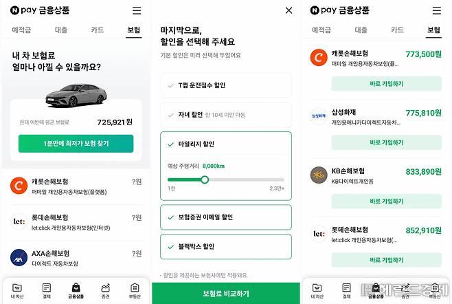 [헤럴드경제=강승연 기자] 네·카·토 등 핀테크 플랫폼을 통한 보험상품 비교·추천 서비스가 시작되자, 시행 초기 고객을 유치하려는 핀테크사들과 자동차보험사들이 할인 등 혜택을 강화하며 치열한 눈치 싸움을 벌이고 있다.