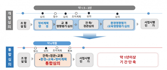 그동안 건축 심의, 경관 심의 등 일부 심의 과정을 통합 운영해왔으나 이번에 환경영향평가, 교육환경평가, 도시관리계획(정비계획), 도시공원조성계획 심의까지 통합 확대했다.