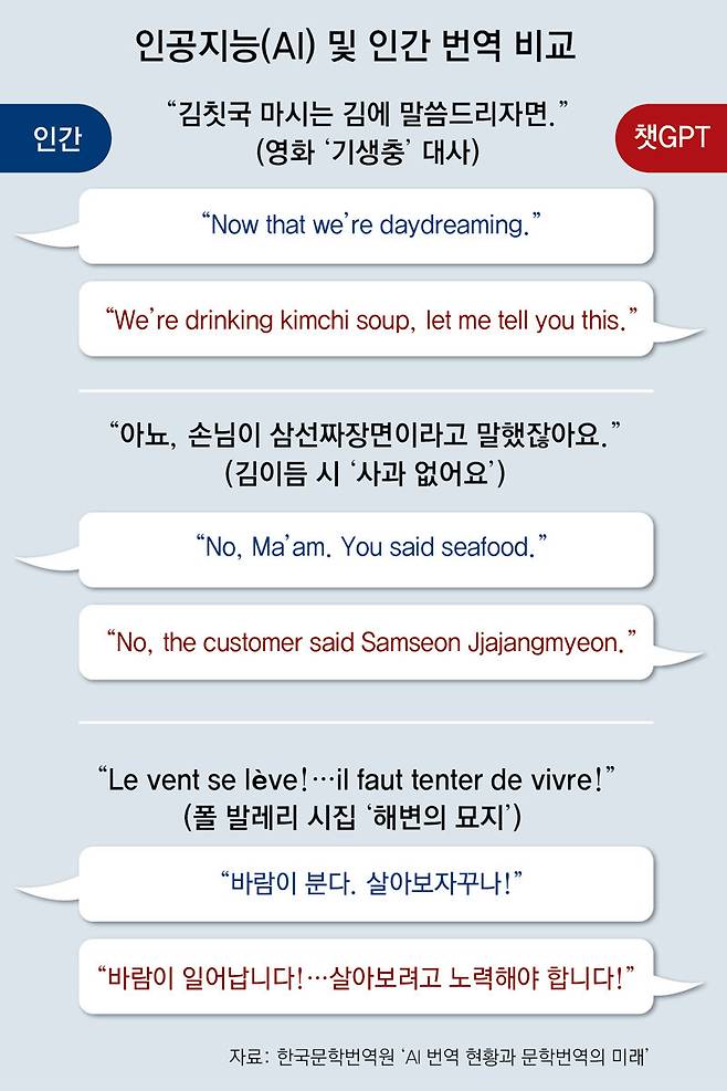 해외 대형 출판사들이 AI 번역기 활용을 금지한 표면적인 이유는 ‘오역 우려’다. AI 번역기가 문장을 직역해 저자의 뜻을 왜곡한다는 것. 예를 들어 지난해 5월 한국문학번역원이 연 심포지엄 ‘AI 번역 현황과 문학 번역의 미래’에선 AI 번역기에 의한 오역 사례가 다수 발표됐다. 예컨대 프랑스 시인 폴 발레리(1871∼1945)의 시 ‘해변의 묘지’의 일부분(“바람이 분다. 살아보자꾸나”)을 챗GPT는 “바람이 일어납니다! … 살아보려고 노력해야 합니다!”라고 잘못 번역했다.