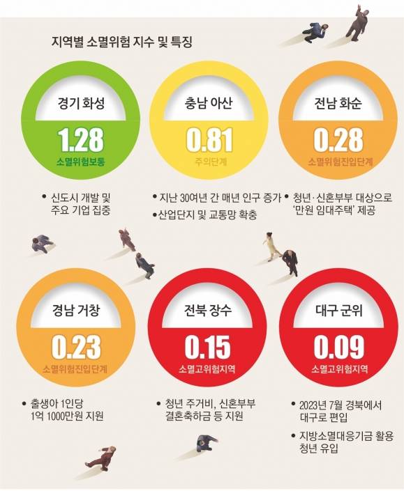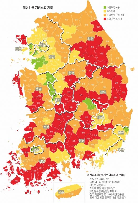 지방소멸위험지수는 마스다 히로야 전 일본 총무상이 처음 도입한 개념으로 20∼39세 여성 인구를 65세 이상 고령 인구로 나눈 값이다. 0에 가까울수록 소멸에 근접하고 있음을 뜻한다.