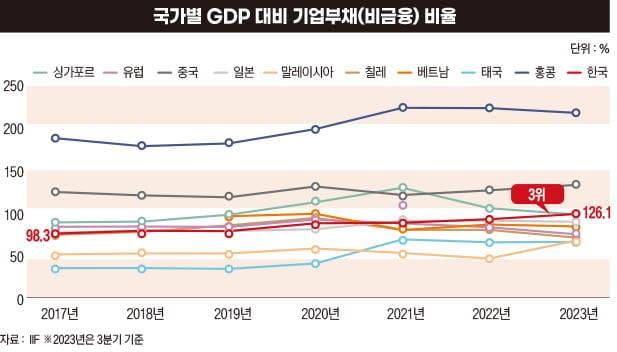 하지만 한국 기업들은 예외였다. 2022년 3분기(120.4%)와 비교해도 한국의 기업부채 비율은 5.7%포인트 더 높아졌다. 지난 1년간 기업부채 비율이 상승한 나라는 한국을 포함해 러시아, 중국 등 9개국에 불과했다.