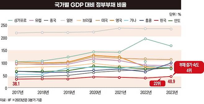 가계, 기업이 흔들리면 정부가 받쳐줘야 한다. 다행히 한국 정부 사정은 좀 나은 편이다. 한국 GDP 대비 정부부채 비율은 48.9%였다. 주요국 가운데 22위로 비교적 안전한 편에 속한다.