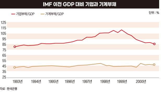 외환위기 당시 GDP 대비 기업대출 비율은 108.6%였지만 가계대출 비율은 40%대를 유지했다. 한국이 세계에서 가장 빠른 시간에 빚을 갚고 다시 일어선 힘이었다.