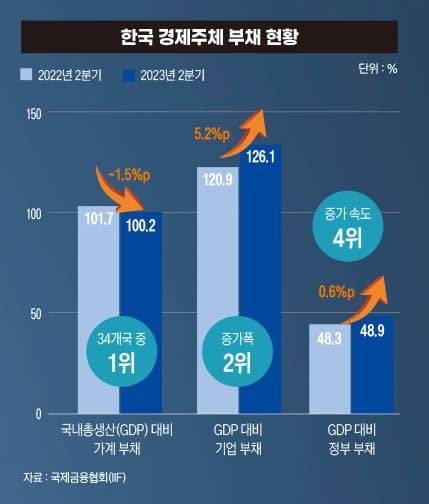 국내총생산(GDP) 대비 가계부채 비율은 세계 1위, 기업부채 증가속도는 세계 2위이며 주요국 가운데 유일하게 GDP 대비 총부채 비율이 높아진 나라가 됐다.