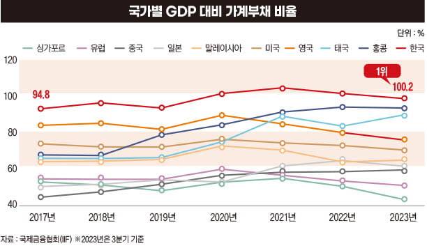 국제금융협회(IIF)가 최근 내놓은 가계부채 관련 보고서를 보면 작년 3분기 기준 한국의 GDP 대비 가계부채 비율은 100.2%로 집계됐다.