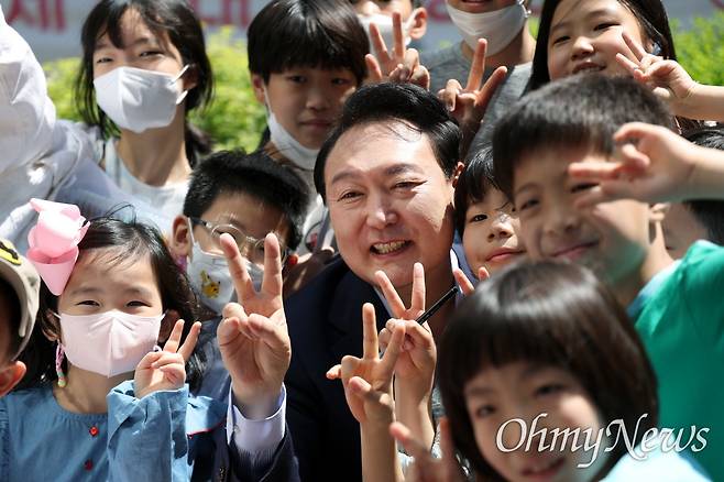 | ▲ 2022년 5월 5일 당시 윤석열 대통령 당선인이 서울 서초구 아크로비스타에서 어린이들과 사진을 찍고 있다. |