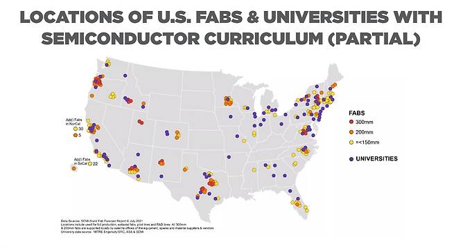 | ▲ 미국의 반도체 팹과 반도체 학과가 있는 대학의 위치. 팹도 대학도 미국 전역에 골고루 퍼져 있습니다. |