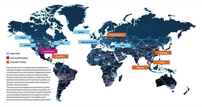 | ▲ 인텔의 반도체 제조시설 위치. 세계 곳곳에 흩어져 있고, 미국 안에서도 멀리 떨어져 있습니다. |