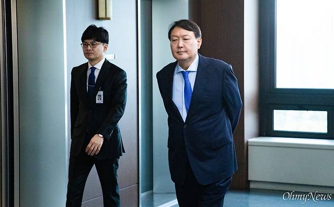 | ▲ 윤석열 검찰총장이 2019년 10월 17일 오전 서울 서초구 대검찰청 법사위 국정감사를 앞두고 회의장 앞에서 조국 전 장관 관련 수사를 총괄지휘하는 한동훈 검찰 반부패강력부장과 대화를 하고 있다. |