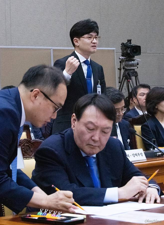 | ▲ 한동훈 검찰 반부패강력부장이 2019년 10월 17일 오후 서울 서초구 대검찰청에서 열린 법사위국정감사에서 질의에 답변하고 있다. |