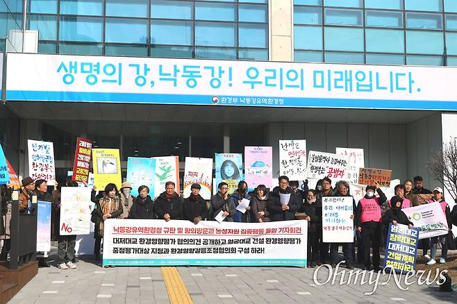 낙동강네트워크, 낙동강부산네트워크, 낙동강하구지키기전국시민행동, 환경영향평가제도개선전국연대(준)가 22일 오후 낙동강유역환경청 현관 앞에서 기자회견을 열어 이같이 외쳤다.