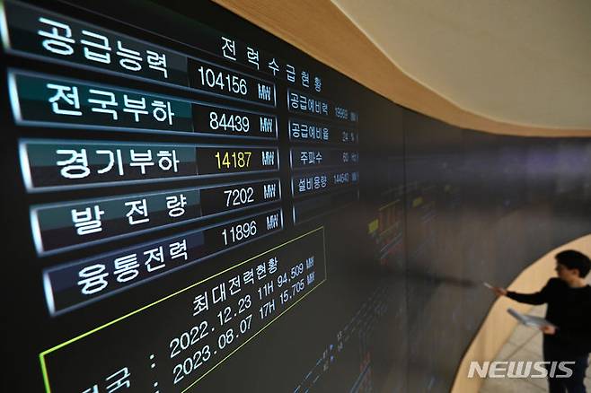 [수원=뉴시스] 김종택 기자 = 전국 대부분지역에 한파주의보가 발효된 22일 경기도 수원시 영통구 한국전력공사 경기지역본부 전력관리처 계통운영센터에서 관계자가 전력수급현황을 점검하고 있다. 2024.01.22. jtk@newsis.com