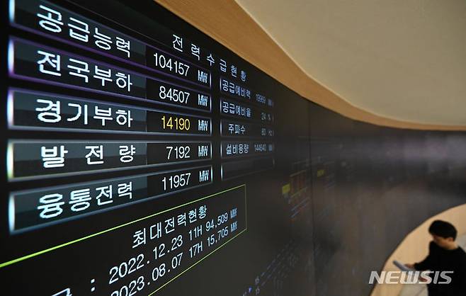 [수원=뉴시스] 김종택 기자 = 전국 대부분지역에 한파주의보가 발효된 22일 경기도 수원시 영통구 한국전력공사 경기지역본부 전력관리처 계통운영센터에서 관계자가 전력수급현황을 점검하고 있다. 2024.01.22. jtk@newsis.com