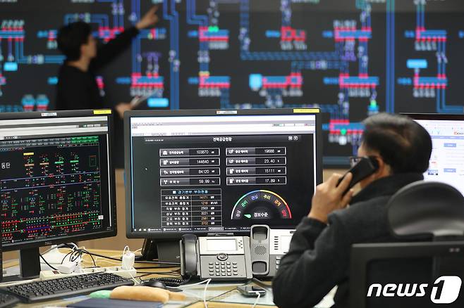 (수원=뉴스1) 김영운 기자 = 영하권의 강추위가 이어진 22일 오후 경기 수원시 영통구 한국전력공사 경기지역본부 전력관리처 계통운영센터에서 관계자들이 전력 수급 상황을 점검하고 있다. 2024.1.22/뉴스1