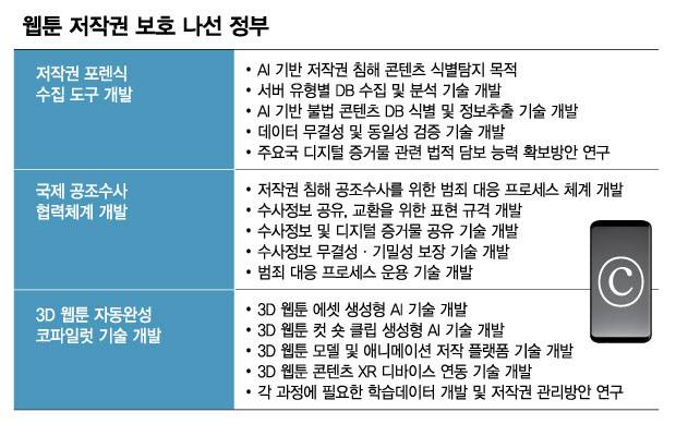 정부가 웹툰 저작권 보호를 위해 팔을 걷어붙이고 나섰다. 정부는 저작권 침해를 당한 웹툰 플랫폼들이 활용할 수 있도록 포렌식 도구를 개발하는 한편 국제 공조에도 적극적으로 나설 방침이다. 업계에서 논란이 되는 생성형 AI 웹툰 제작 툴에 대해서도 국가 주도 개발로 모범 사례를 제시할 계획이다.